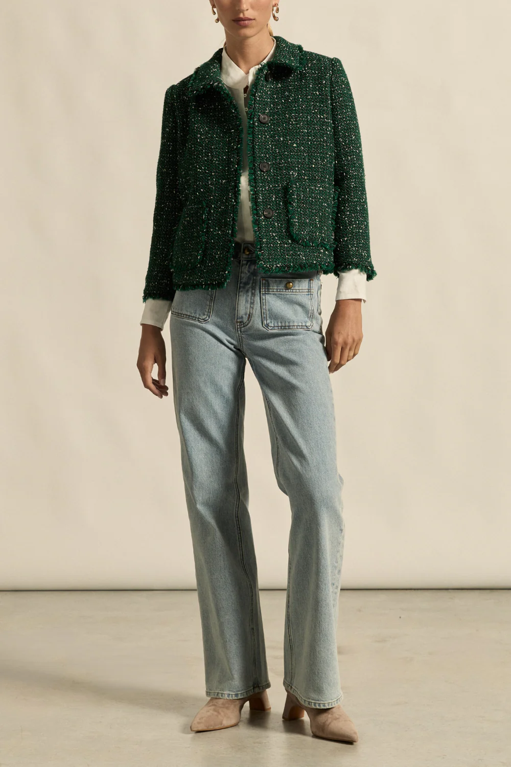 A statement in texture and tailoring, the Certify Jacket in Emerald Bouclé brings elevated structure with a refined edge.