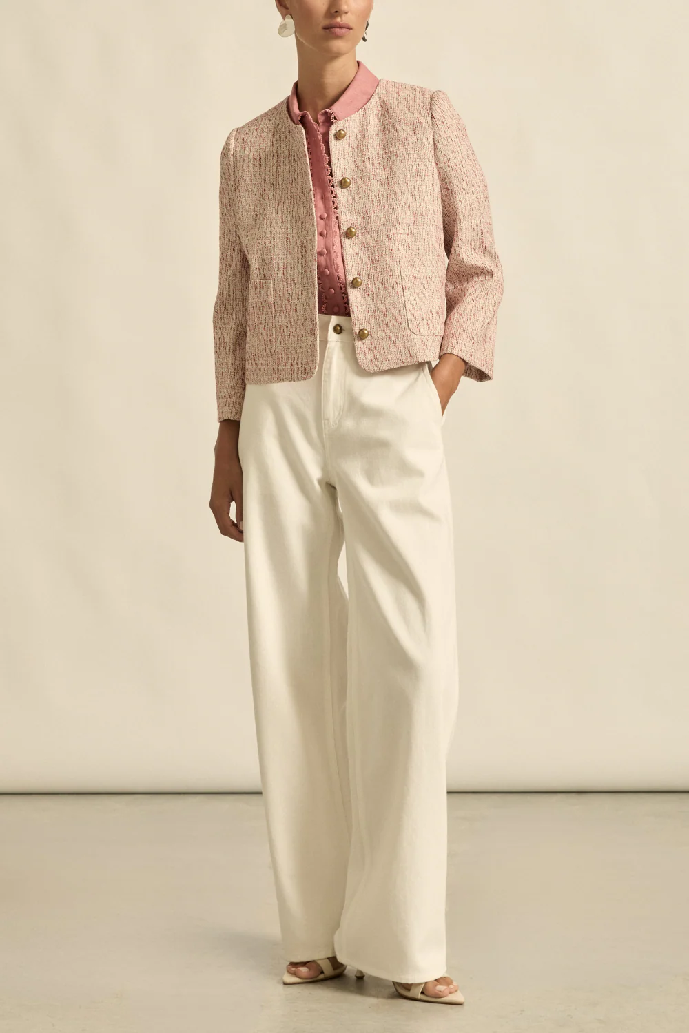 this summer-weight boucle jacket pairs nostalgic charm with a modern silhouette, offering polish with personality.