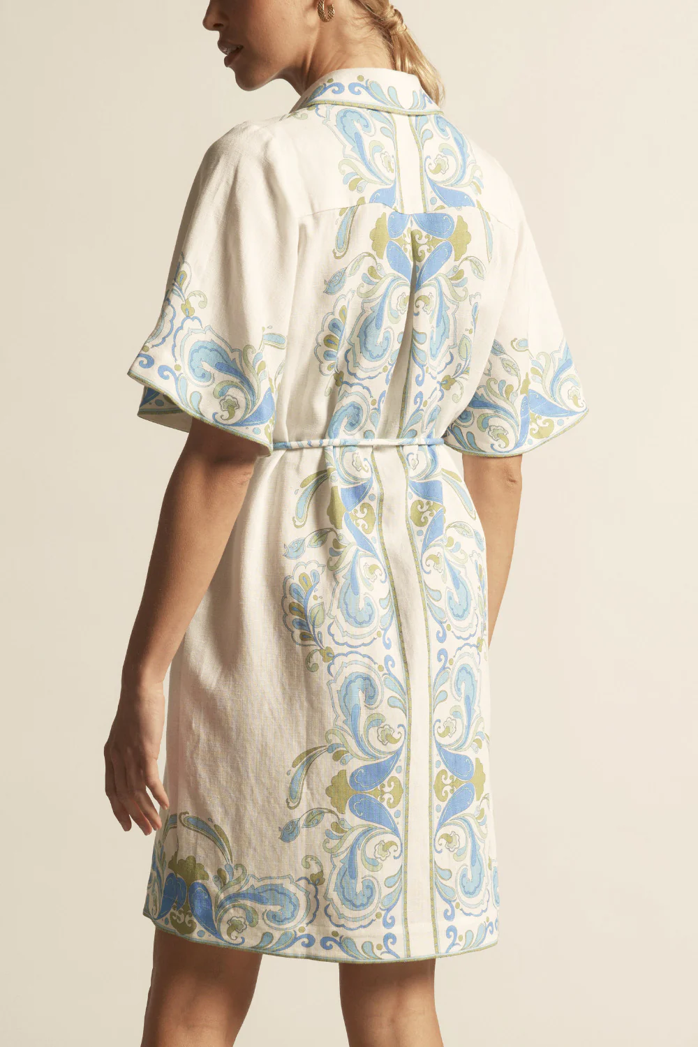 the forum tunic dress balances structure and softness. the aqua mirage print offers fresh dimension, while brass domed buttons and a crisp collar anchor the design. the result is a versatile piece for relaxed daywear to resort styling with ease.